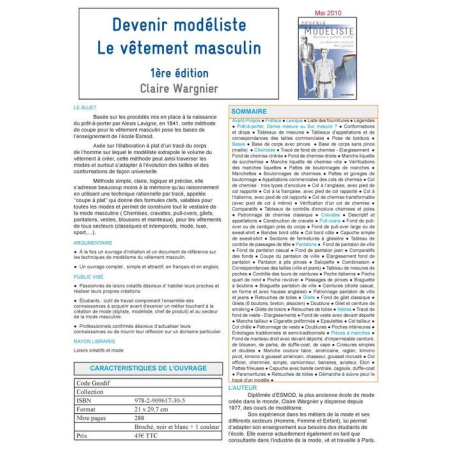 Les bases du vêtement de ville et de sport. Méthode simple, claire, logique et précise, elle s'adresse beaucoup moins à la mémoire qu'au raisonnement en utilisant une technique rationnelle par tracé, appelée coupe à plat qui donne des formules clefs, valables pour toutes les modes et permet de construire tout le vestiaire de la mode masculine, de la chemise aux manteaux : Chemises, cravates, gilets, pull-overs, pantalons de ville, jeans, vestes et manteaux de tous styles (classiques et intemporels, mode, luxe, sport,...)... Cette méthode reste donc à la portée de tous, qu'il s'agisse de personnes désirant habiller leurs proches et réaliser leurs propres créations ou de personnes se destinant aux métiers de la création de mode : patronnières, stylistes, modélistes, chefs de produits, industriels du textile-habillement. Edition bilingue français/anglais Présence de tableaux de mesures en 15 langues.